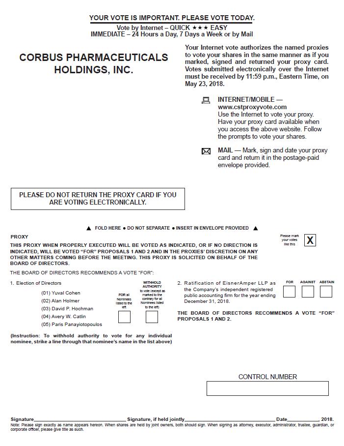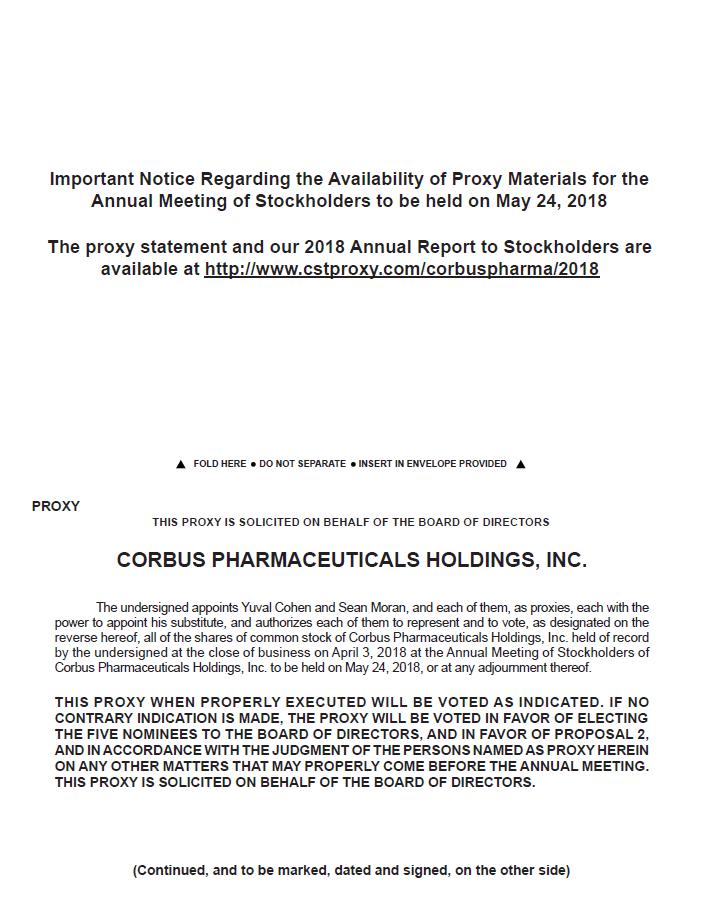 Our proxy materials including our Proxy Statement for the 2018 Annual Meeting, our Annual report for the fiscal year ended December 31, 2017 and proxy card are available on the Internet at http://www.cstproxy.com/corbuspharma/2018. Under Securities and Exchange Commission rules, we are providing access to our proxy materials by notifying you of the availability of our proxy materials on the Internet.